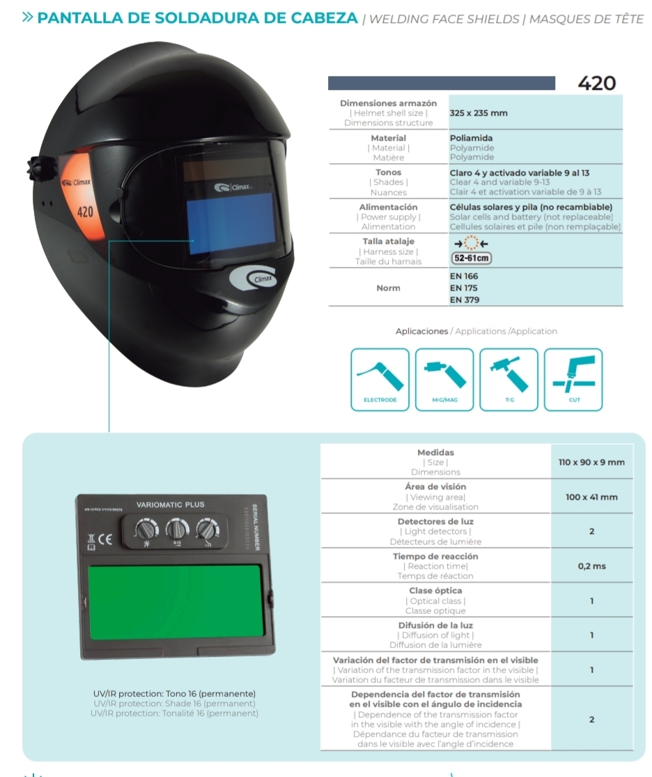 西班牙Climax 420 電子變色燒焊面罩是一款高級自動焊接保護罩,適用於大多數類型的焊接,包括MIG,TIG和等離子切割和焊接(不適用於激光或氣體焊接)。焊鏡頭帶可手動調節,頭帶設計亦易於單手調節。
