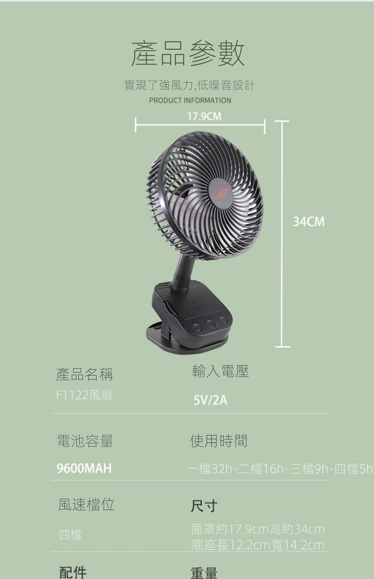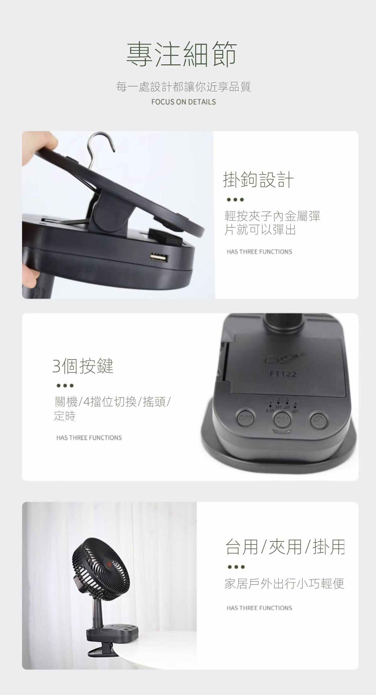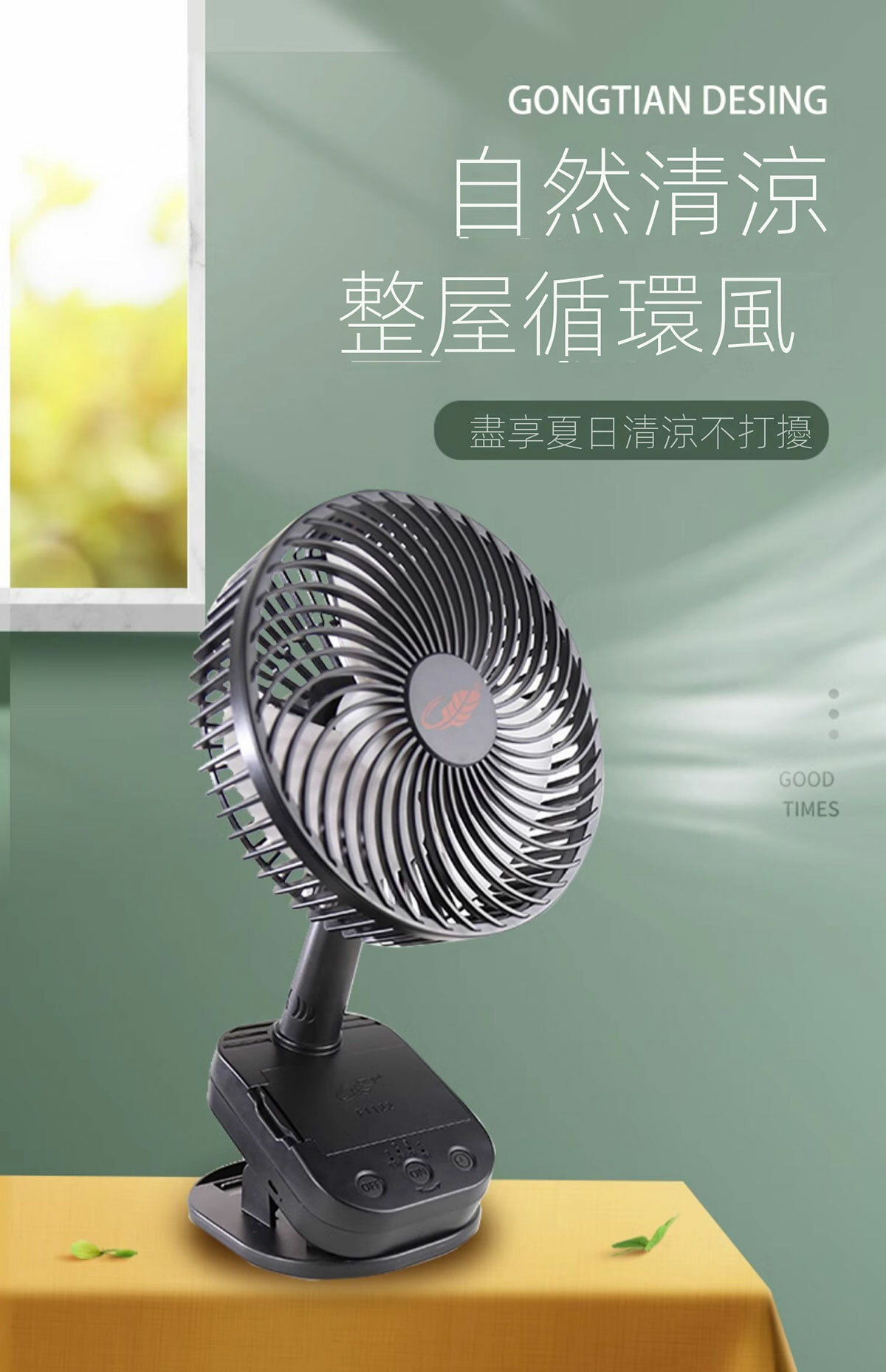 共田 F1122 夾台自動搖頭風扇具備6吋扇葉,可以長按開關制控制旋轉,風扇設有4個風力檔次座檯,夾檯,掛牆亦非常合適
