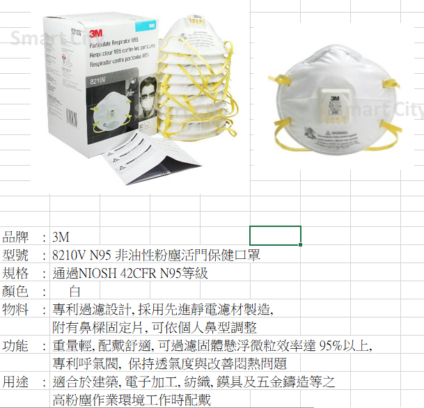 3M-8210V 帶閥防塵口罩N95級口罩。碗狀設計及可調式鼻梁夾,減少霧氣產生與改善密合度。與多種眼部防護具及聽力防護具相容。專利矩型呼氣閥,降低呼氣空氣阻抗與改善悶熱問題。適用於悶熱,多塵的工作環境或長時間的配戴。